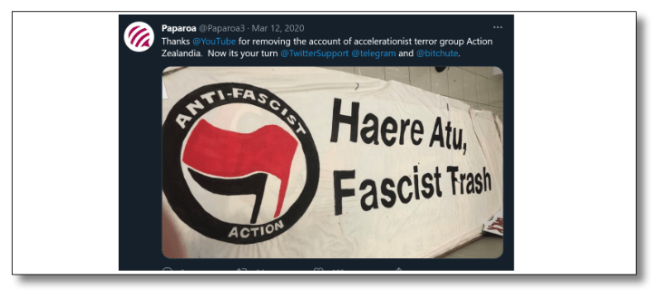 Why are they using this innocuous phrase when the truth is it was the Antifascist group Paparoa, who constantly monitor what they perceive as the “right wing threat” and are highly politically motivated in what the do? Media should tell the public who Paparoa really are.
