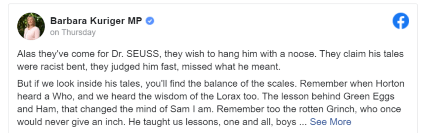 A National Party MP has spoken out against the banning of Doctor Seuss books, posting a series of spirited Seuss like poems on facebook. Its rare for the Nats to push back on this kind of thing, and usually they can’t wait to add support to the stinking self righteous left wing chorus of disapproval.