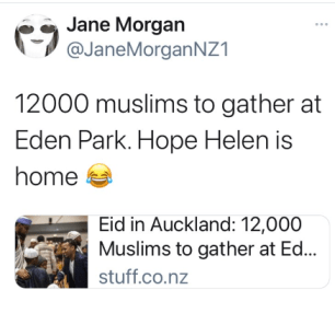 NZ citizen Jane Morgan posted a tweet (see pic) making a joke about Helen Clark, and the Eid celebration, which was obviously refencing Clark’s aversion to noise from the park.