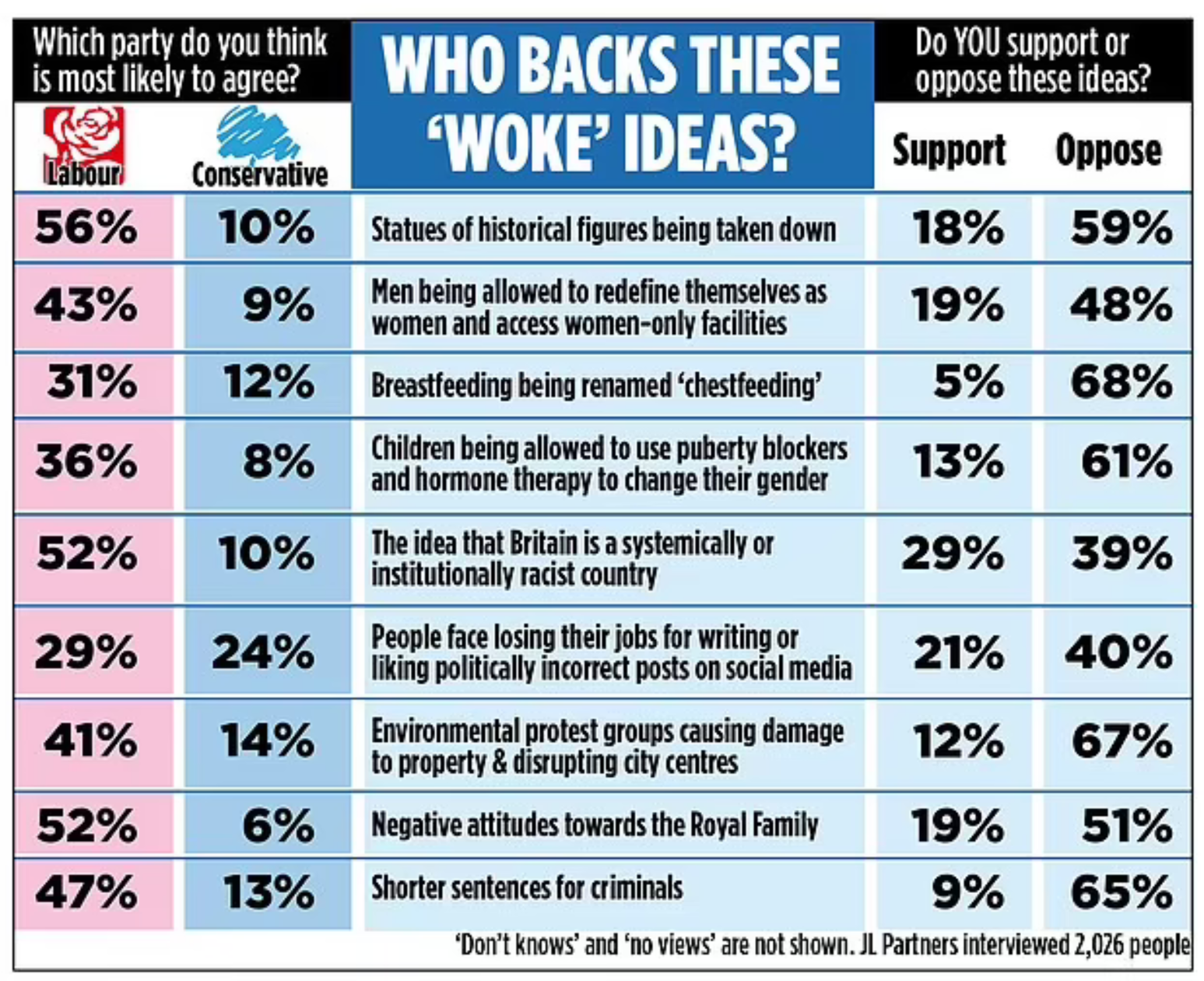 How do we know its a minority? In the UK an organisation called the Campaign For Common Sense asked company JL Partners to conduct a poll to ascertain who really supports wokeness. JL Partners surveyed 2026 people between May 12th and 14th. The Daily Mail has put the results into a handy graphic, and there is no doubt over the outcome.