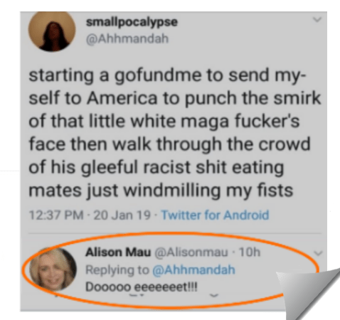 New Zealand Reporter of the Year 2020 Alison Mau was in boots and all during the Nick Sandmann attack phase. One of Mau’s feminist friends tweeted her desire to “punch the smirk off that little white maga fucker’s face and then walk through the crowd of his gleeful racist shit eating mates just windmilling my fists”. Mau responded “Dooooo eeeeeeet!!!”.