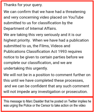 So the actual arrest was triggered by the Censor’s classification. Did the alleged offender know of this? Was the man give a chance to take the video down himself? Is the Censor now NZ’s front line defender in the war on terrorism? All in all, this seems like a pretty patchwork application of law.