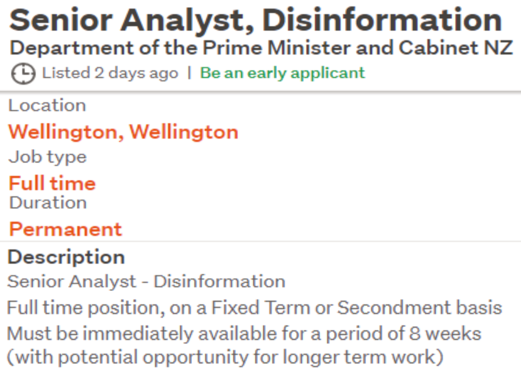 “familiar with proactively searching across public facing social platforms. They will actively monitor open source social media channels, to triage across these channels and to case-manage issues. You will work as part of a small team in DPMC and connect in with a larger cross-government networks, working to respond to, and build resilience to, disinformation in New Zealand”