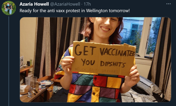 In this context that it is anti-vaxers versus the vaccinated. In reality there are many positions, such as pro-vaccination but anti mandate. I bet a good deal of the protesters are not even protesting anything to do with vaccines, but simply protesting Saint Jacinda, and Grunter the Son-of-a-Fraudsters determination to fly the economy of NZ into the equivalent of the side of Mt. Erebus via lockdown policies the consequences of which will be felt for a generation. The anointed one probably got a hell of a shock seeing some of the largest NZ protests in recent times.