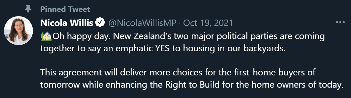 In a move considered a deep betrayal by some National supporters, Willis enthusiastically backed and even jointly promoted (with Megan Wood) Labour’s new environmental regulations allowing high density flats to be built on previous one house sections.